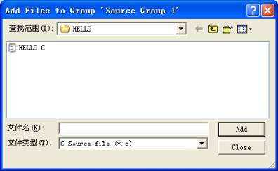 7.需要特别提出的是,这个程序文件仅仅是建立了而以,hello.c文件到现在为止,跟hello.uV2工程还没建立任何关系,此时用户应该把hello.c源程序添加到hello.uV2工程中,构成一个完整的工程项目,点击菜单View->Project Window将会弹出项目观察窗口,在项目观察窗口内,选中Source Group1后点击鼠标右键,在弹出的快捷菜单中选择ADD Files to Group “Source Group1”(向工程中添加源程序文件)命令,此时会弹出如图2.10所示的添加源程序文件窗口,选择刚才编辑的源程序文件hello.c,单击Add命令即可把源程序添加到项目中。