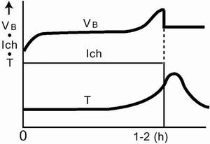 因为NiCd电池的电荷接收度接近100%,所以在开始70%充电期间吸收几乎所有的能量,而电池保持微冷。超快速充电器利用该特点,在几分钟内把电池充电到70%电平,所加电流等于几倍的C率,而无热量产生。达到70%电平之后,电池以较低速率继续充电,直到电池充满电为止。最后,加0.02~0.1C涓流结束电池充电。