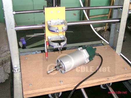 继续上雕刻机制作过程(安装主轴) 今天将主轴安装到Z轴滑台上,别看滑台不大,刚性非常好,主轴纹丝不动,这是用来作主轴的修边机(6mm),安装主轴制作的卡子,