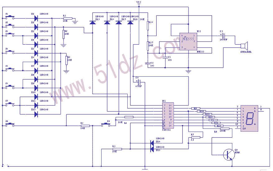 | 选择分类:当前分类——电子制作 相关联或者相类似的文章: 怎样安装AT51编程板的USB转串口软件?(8206) 装在火柴盒里的悄悄听别人讲话的发射器(1999) 红外感应电子狗制作详解(1560) 台灯触摸开关(1560) ++ 带限流保护的可调稳压电源 (1331) 分立电子开关、OTL功放详解(1274) 用单片机控制字符型液晶显示模块(1249) 厨房定时器(1160) 电子制作专用微型模块盒子(1132) 性能可靠的60W石英灯用电子变压器(1091) 做梦机的制作(1078) 自己动手制作无线话筒(944) MA21小型电子调速器的制作(939) 500米无外壳四通道遥控模块(926) 关于“D40”最早的文章(907) 用三端稳压LM317制作的甲类功放(898) ++ 汽车电池电压监视器 ++(897) 电子小鸡(896) 简单实用的遥控开关(895) 简易电话机测试装置(889) 首页 前页 后页 尾页 本站推荐: | 简易8路数显抢答器制作过程 简易8路数显抢答器:简单实用的八路数显抢答器,主要包括抢答、编码、优先锁存、数显、复位及音频振荡等电路。元器件主要包括CD4511.NE555、IN4148、三极管(9 0 1 4)、LED 共阴极数码管、扬声器、小型按钮开关及电阻电容等。 说明:抢答数显电路:J1~J8 八个按钮开关组成抢答键。D1~D12 十二个二极管组成编码器,将抢答键按对应的BCD 码进行编码,并将所得的高电平加在CD4511 所对应的输入端。CD4511 是一块含BCD —七段锁存/ 译码/ 驱动电路于一体的集成电路。CD4511 的1、2、6、7 脚为BCD 码输入端,9~15 脚为显示输出端。3 脚为测试端(LT),当L T 为“0 ”时,输出全为“1 ”。4 脚为消隐端(B I ),当B I 为“0 ”时,输出全为“0 ”,因此此时可以清除锁存器内的数值,即可使用为复位端。5 脚为锁存允许端(L E ),当L E 端由“0 ”→“1 ”时,a 、b 、c 、d 、e 、f 、g 七个输出端保持在LE 为“0”时所加BCD 码对应的数码显示状态。16、8 脚分别接电源正负极。由CD4511 的引脚图可知,6 、2 、1 、7 脚分别代表BCD 码的8、4、2、1 位。按下对应的键,即可得到0001、0010、0011、0100、0101、0110、0111、1000 八个一系列的BCD 码。高电平加在CD4511 对应的输入端上,便可以由其内部电路译码为十进制数在数码管上显示出来。优先锁存电路由两个二极管(D13、D14)、一个三极管(VT)、两个电阻及CD4511的锁存允许端(LE)完成。在初始状态或复位后的状态时,CD4511 输入端都与一个电阻(10K)串联接地,所以此时BCD码输入端为“0000”,则CD4511 输出端a、b、c、d、e、f 均为高电平,g 为低电平,且数码显示为“0”。而当d 为高电平,三极管(VT)导通及g 为低电平时, D13、D14 的正极均为低电平,使CD4511 的LE 端为低电平“0”,可见,此时没有锁存即允许BCD码输入。而当任一抢答键按下时,由数码显示可知,CD4511 输出端d 输出为低电平或输出端g输出为高电平,两个状态必有一个存在或着都存在。迫使CD4511的LE端,由“0”→“1”,即将首先输入的BCD 码显示的数字锁存并保持。此刻,其它按键编码就无法输入,从而达到了抢答的目的。音频振荡电路为NE555组成的多谐振荡器推动扬声器发出讯响声。四只二极管(IN4148)组成二极管或门电路分别接CD4511 的1、2、6、7 引脚,为NE555 提供电源+Ucc,即任何抢答键按下时,扬声器都能发出报警声。 抢答器的组装与调试 1抢答器简述 抢答器可以根据抢答情况,显示优先抢答者的号数,同时蜂鸣器发声,表示抢答成功。抢答器由抢答、编码、优先、锁存、数显及复位电路组成。 2抢答器工作原理 抢答器电路原理图见附件。 该抢答器电路可同时进行八路优先抢答。按键按下后,蜂鸣器发声,同时(数码管)显示优先抢答者的号数,抢答成功后,再按键,显示不会改变,除非按复位键。复位后,显示清零,可继续抢答。SB1~SB8为抢答键;SB9为复位键;CD4511是一块含BCD-7段锁存/译码/驱动电路与一体的集成电路,其中1、2、6、7脚为BCD码输入端,9~15脚为显示输出端,3脚(LT)为测试验出端,当LT为0时,输出全为1,4脚(BI)为0时输出全为0,5脚(LE)为锁存允许端,当LE由“0”变为“1”时,输出端保持LE为0时的显示状态。16脚为电源正,8脚为电源负。555及外围电路组成抢答器声响电路。 3考试试题 1.元器件识别、筛选、检测(10分) 仔细清点套装材料的数量,并对套装元器件进行识别、检测与筛选,检测过程中填写下表。