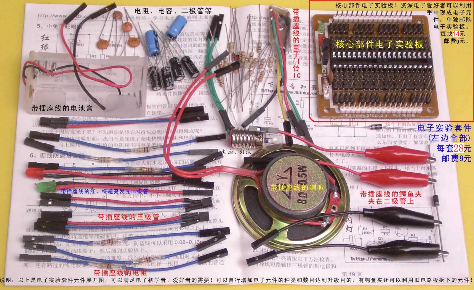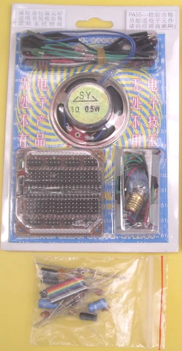 套件中有电阻、电容、二极管、三极管等,只要能看得懂中文汉字就可以做以上实验,可以学习到电阻对电流的阻碍作用、电容的充放电作用、二极管的单向导电性等等各种电子元件的有关知识。