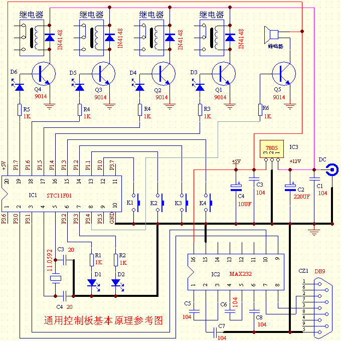 如果没连接电脑或电脑没运行控制软件,本板就是一个四路手动开关控制板,可以通过四个按键来控制四个继电器输出,此时,LED1熄灭,同时蜂鸣器嘀嘀响,表示没有和电脑联机,本板不受电脑控制。