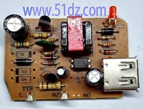 仔细检查线路板安装无误后,要通电试板时,可以在PCB板直接焊一个220V插头线,为了安全起见,请大家先在电源串联一个10W的白炽灯泡,以防止短路或者接错,千万注意安全,还有,元件一不小心就烧坏了,烧坏了需要再买才行。如果安装无误,用万用表可以测得USB 1脚和4脚应有5V的电压输出,电源指示灯亮,确认电路板装配无误。